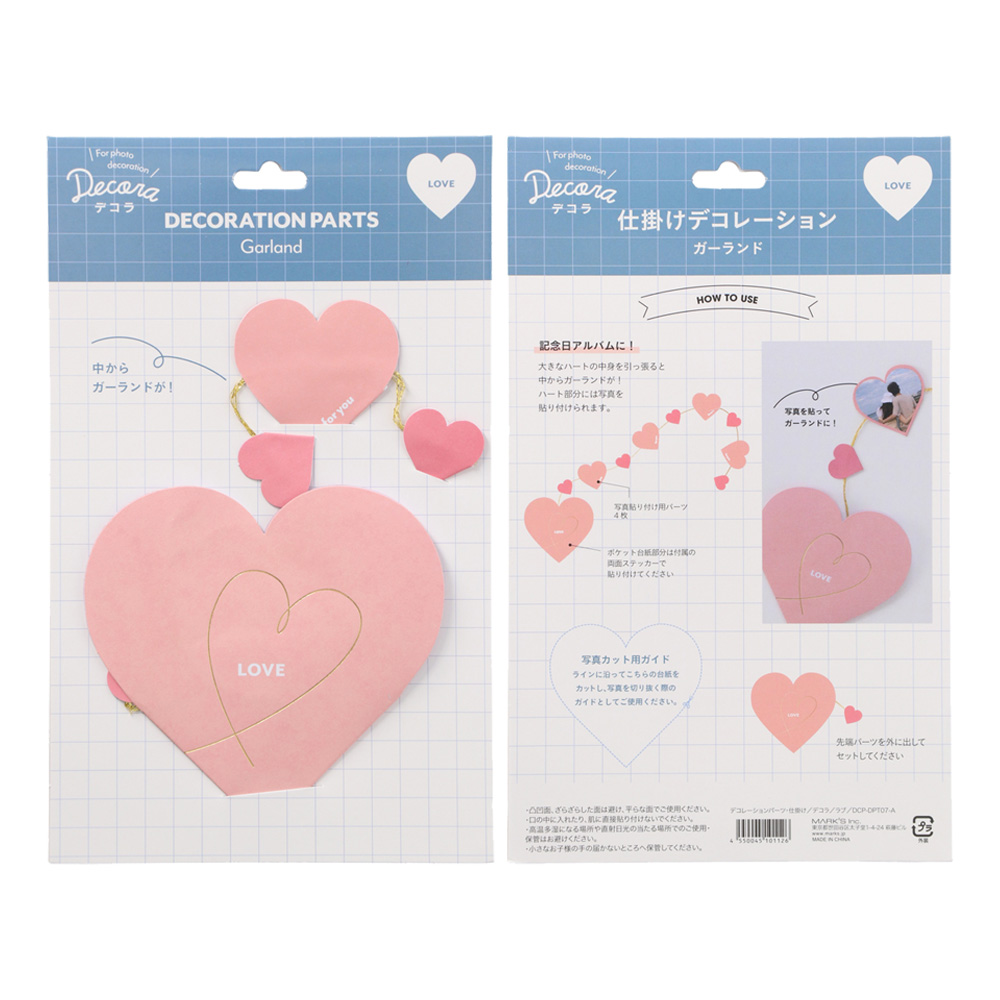 ポケットの本体パーツ内に写真貼り付けパーツ付のガーランドが内蔵されています。 貼り付け用両面ステッカー付き。